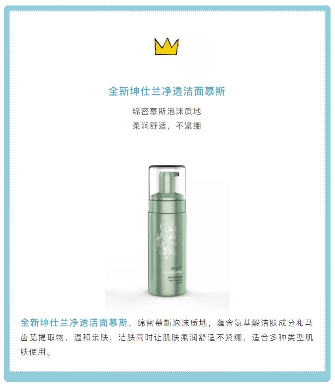 所以我們要換成適合冬天使用的溫和型洗面奶,比如即將上市的全新坤仕蘭凈透潔面慕斯