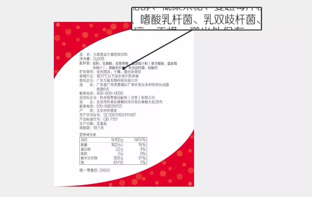 九極愛益生菌產品配料表上明確標示著菌種菌株: